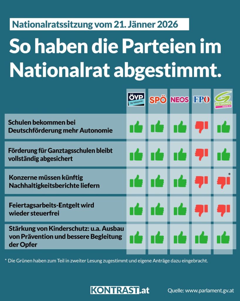 Hier finden Sie das Abstimmungsverhalten der Parlamentsparteien SPÖ, ÖVP, FPÖ, NEOS und Grüne im Nationalrat.