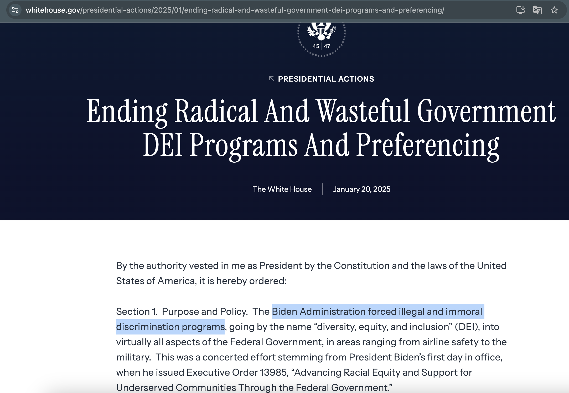 Screenshot Executive Order on „Ending Radical and Wasteful Government DEI Programs and Preferencing“ vom 20. Jänner 2025.