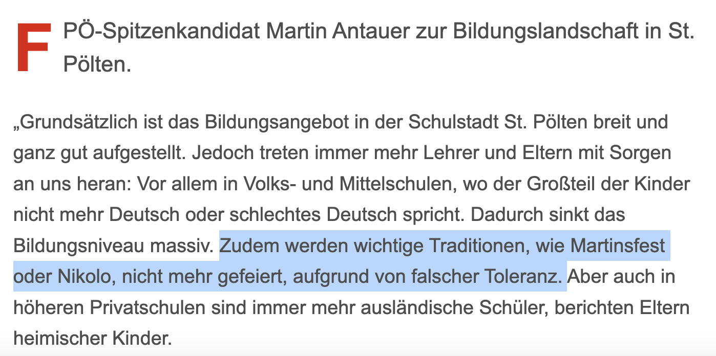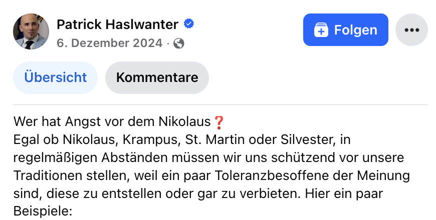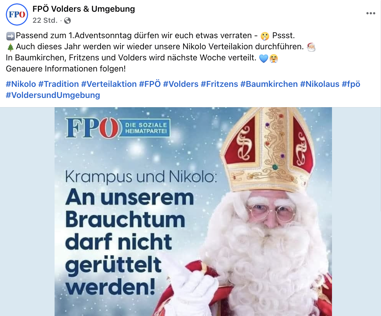 Aber die FPÖ witterte eine Möglichkeit, die Stimmung aufzuheizen und entschied sich, eine Falschmeldung zu verbreiten. Seither behauptet sie beharrlich, man wolle verhindern, dass sich muslimische Kinder vom christlichen Nikolo beleidigt fühlten. Die Lüge über ein angebliches Verbot und Verdrängen dieses Brauchs zieht sich durch mehrere Bundesländer.