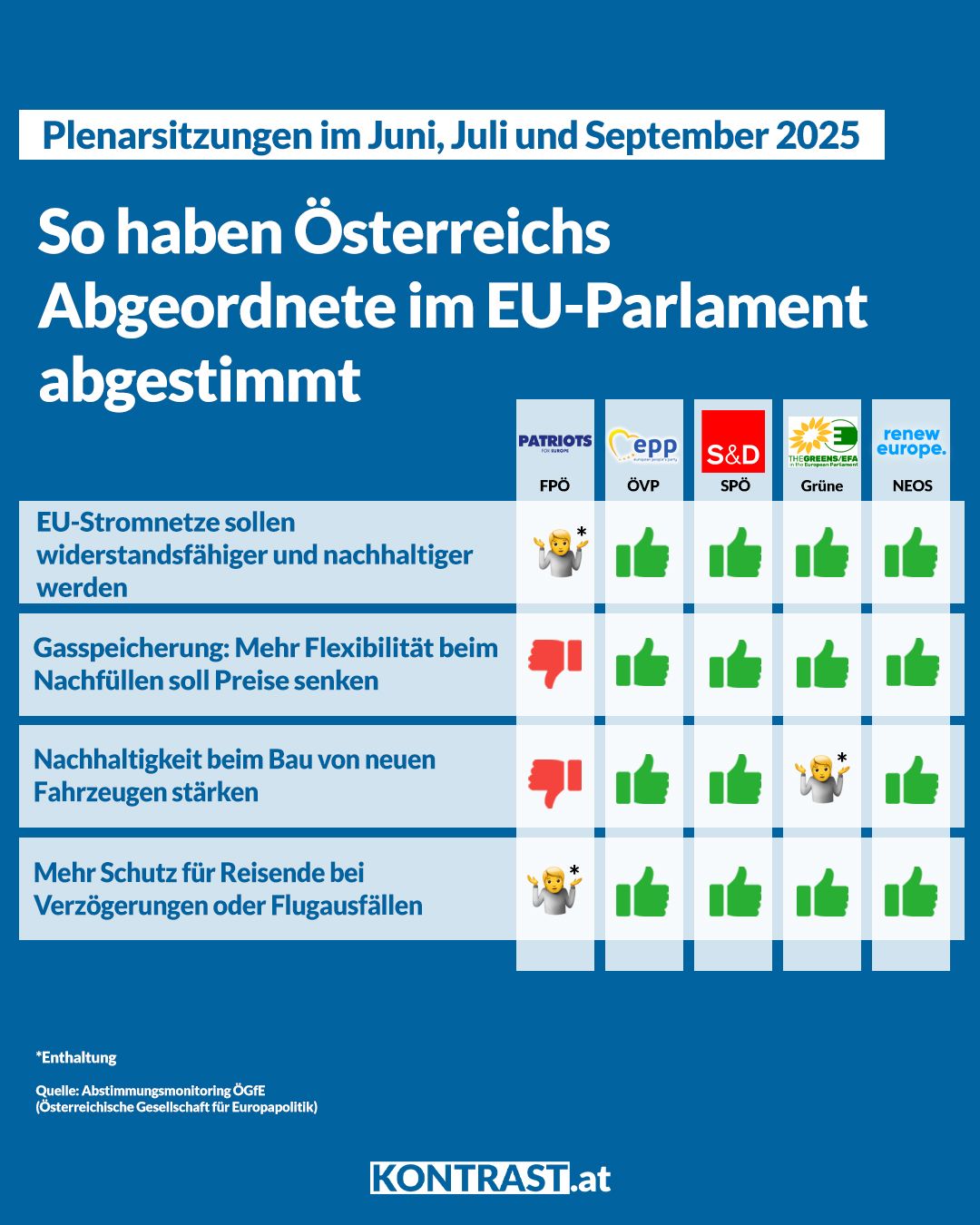 Themen waren unter anderem die Nachhaltigkeit bei Stromnetzen, Gasspeicherung und dem Neubau von Fahrzeugen. Auch der Schutz von Flugreisenden war Thema. Der Großteil der österreichischen Abgeordneten zog bei ihrer Abstimmung an einem Strang. Die Abgeordneten in der von Kickl, Orbán und Babis gegründeten Rechtsaußen-Fraktion „Patrioten für Europa“ fiel auf – und zwar mit Enthaltung und Ablehnung.