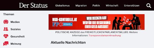 Mit seiner provokanten und ideologisch geprägten Berichterstattung fügt sich auch Der Status nahtlos in das Spektrum der rechtsextremen Medien ein. Die Verschwörungstheorie des „Great Reset“ (der angebliche „Große Austausch“) ist neben Corona ein eigener Schwerpunkt. Der Status bekam für die Kampagne gegen Vereine 4.800 Euro.