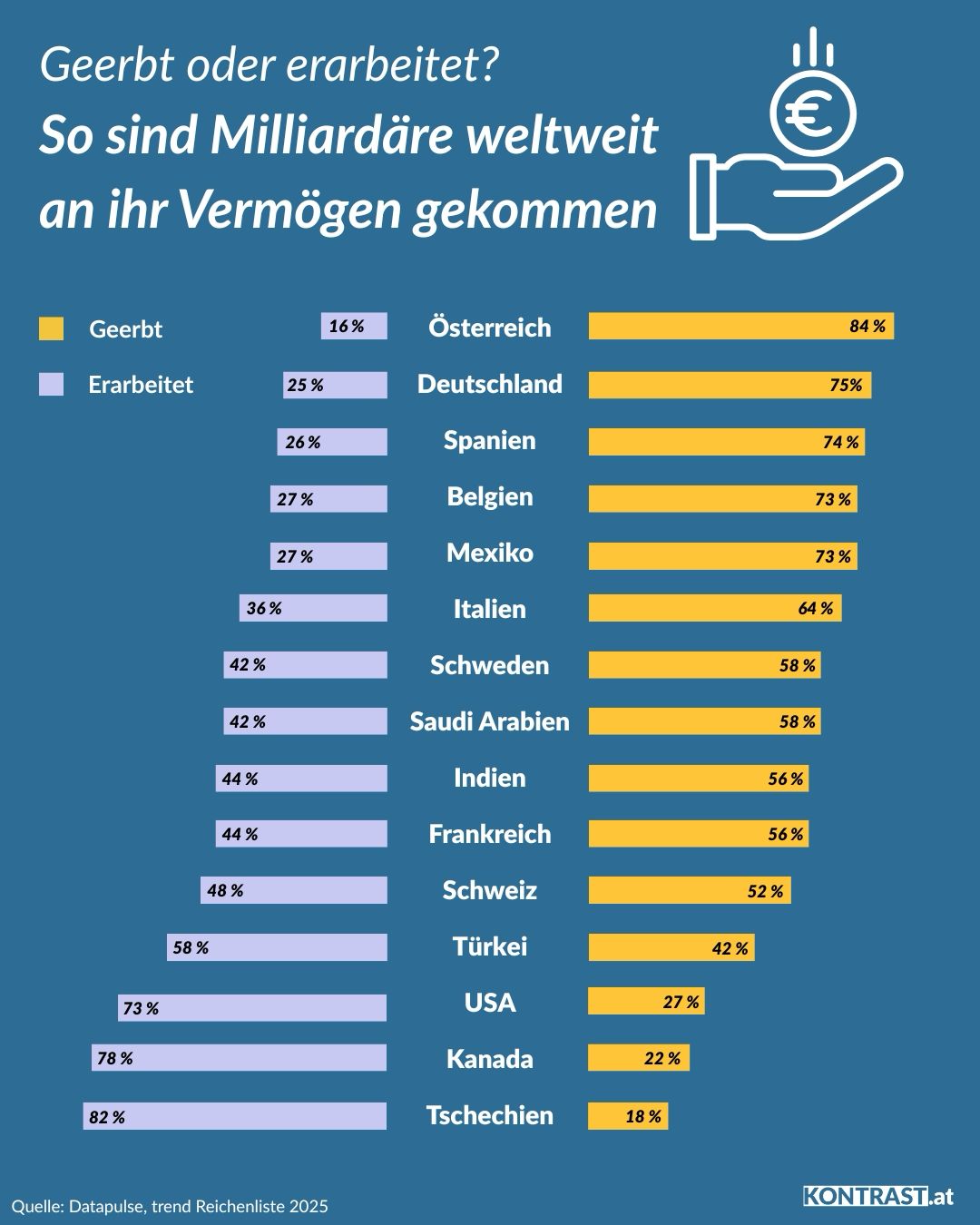 Hierzulande leben laut dem Bericht acht Milliardäre mit einem geschätzten Gesamtvermögen von 76,6 Milliarden Dollar. Für die kommenden 15 Jahre wird erwartet, dass Milliardärsfamilien in Österreich Vermögen von rund 12,7 Milliarden Dollar (fast 11 Milliarden Euro) an ihre Erben übertragen. Zum Vergleich: Für die Gehälter aller Beschäftigten im Gesundheitssystem gibt der Staat etwas mehr als 12 Milliarden Euro jährlich aus.