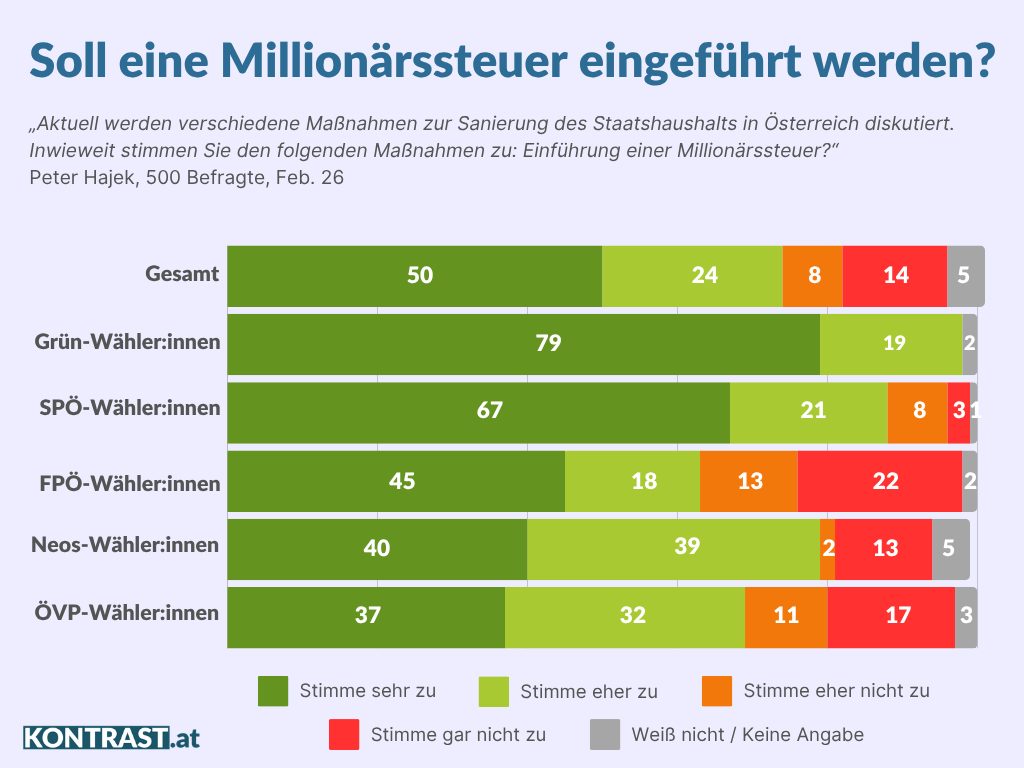 Das ist nicht weiter überraschend. Die Mehrheit der Studien zu diesem Thema hat in den letzten Jahren gezeigt, dass sich die österreichische Bevölkerung eine stärkere Besteuerung großer Vermögen wünscht.
