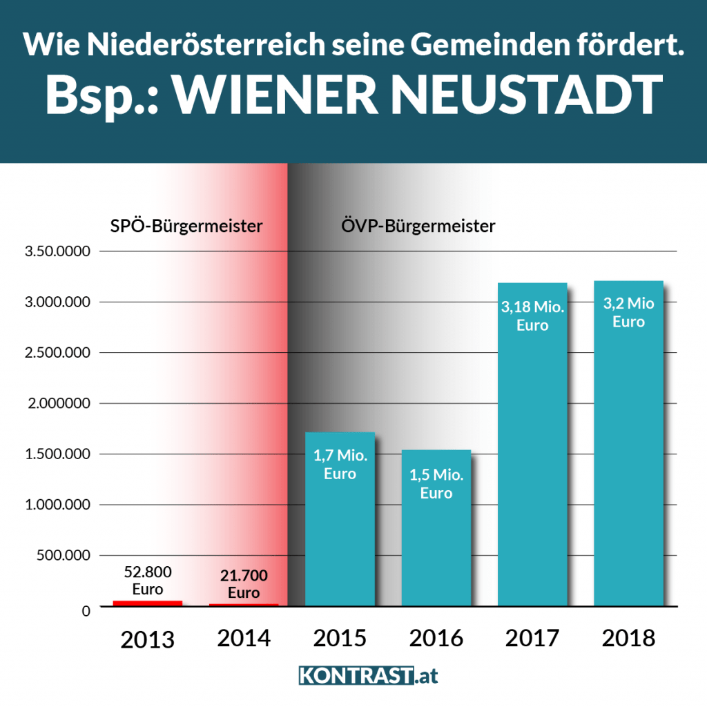 Ins Auge fällt auch der enorme Sprung bei den Bedarfszuweisungen in Wiener Neustadt. Erhielt die Gemeinde 2014 noch 21.700 € im Jahr, sind die Fördergelder 2015 plötzlich auf 1,7 Mio. € hochgeschnellt. Das ist eine Erhöhung um 8.000 Prozent. Und auch seither sind sprudelten die Fördergelder: 2017 und 2018 erhielt die Stadt über 3 Mio. Euro. Doch was ist 2015 passiert? In diesem Jahr ist weder Wiener Neustadts Wirtschaft zusammengebrochen, noch wurde die Stadt von einer Katastrophe heimgesucht. Es hat sich nur die Farbe des Bürgermeisters geändert: Ende Jänner 2015 wurde der Gemeinderat gewählt – seither stellt die ÖVP den Bürgermeister.