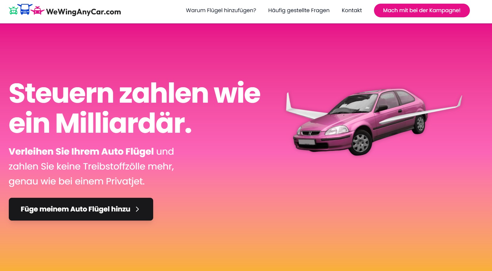Die britische Satire-Kampagne „We Wing Any Car“ macht auf das Steuerprivileg für Privatjets aufmerksam. (Screenshot, Wewinganycar.com)