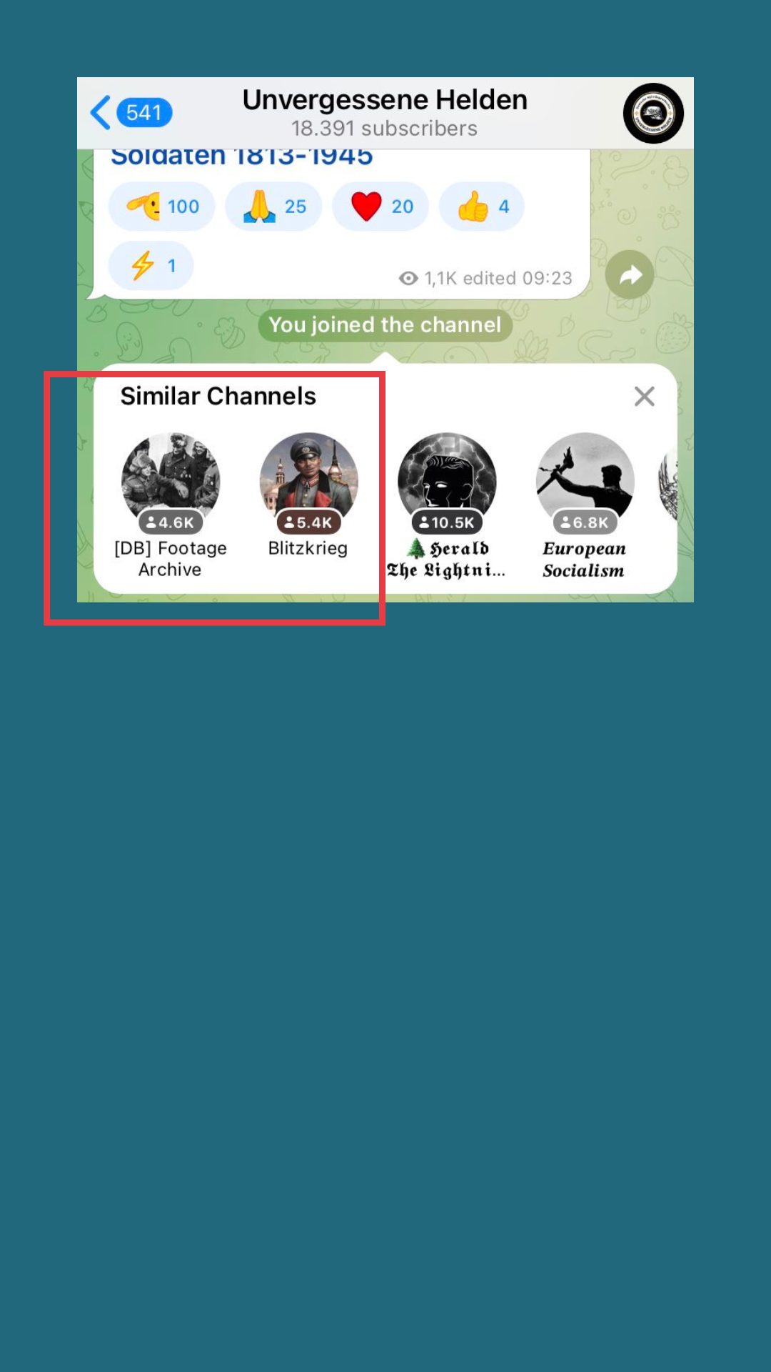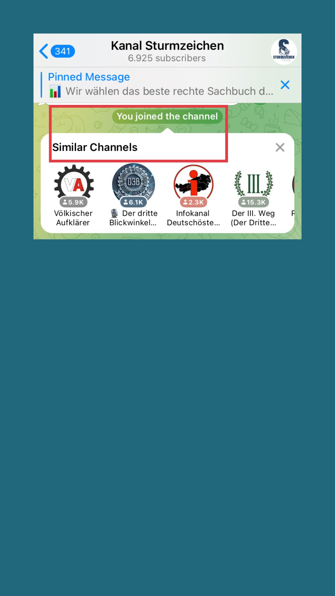 Uns fällt auf, dass man direkt nach dem Beitritt in den Kanal („You joined the channel“) neue „ähnliche Kanäle“ vorgeschlagen bekommt. Beim „Kanal Sturmzeichen“ bekamen wir mehrere Vorschläge.
