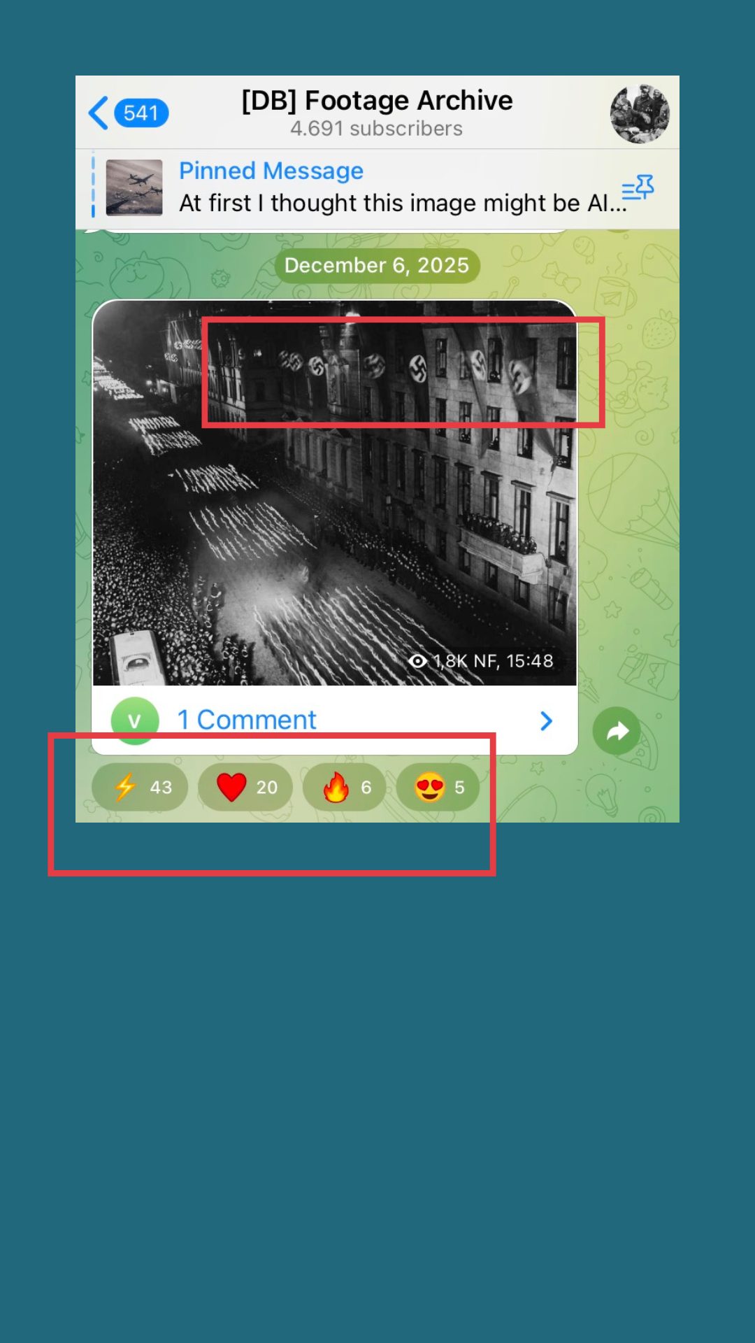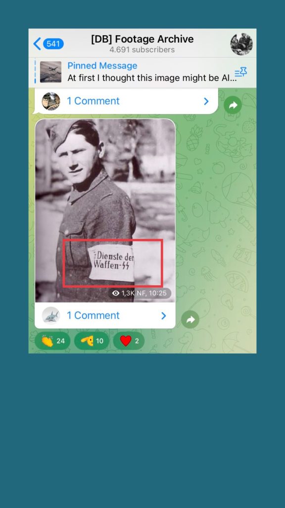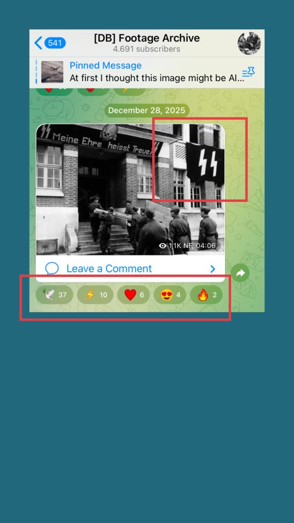 Auch in dem Kanal „DB Footage Archive“ finden wir viele Archiv-Bilder aus der NS-Zeit. Die Emoji-Reaktionen auf die geposteten Bilder sind dabei besonders relevant: Eine weiße Taube, ein Blitz-Emoji, Flammen und Herzen. Die Reaktionen wirken auf den ersten Blick banal. Doch im Kontext offen nationalsozialistischer Inhalte sind sie als Zustimmung und Verherrlichung zu lesen.