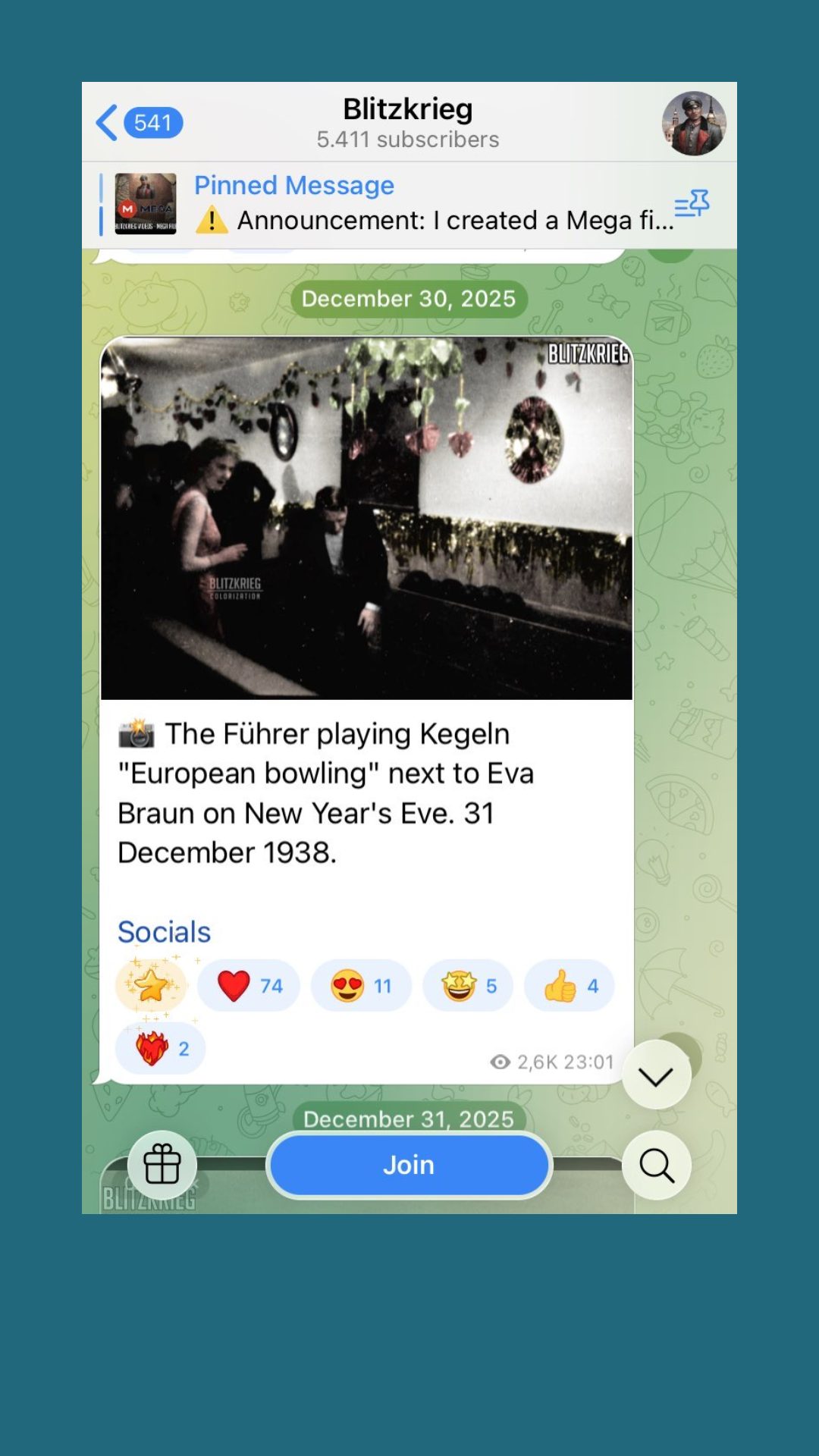 In diesen Kanälen werden fast ausschließlich Inhalte in Form von Archiv-bildern aus der NS-Zeit gepostet: SS-Symbole, Nazi-Aufmärsche und Wehrmachtssoldaten. Die Beiträge werden oft kontext- und beschreibungslos von User:innen hochgeladen. Ein Bild im Kanal „Blitzkrieg“ zeigt Adolf Hitler beim Kegeln. 74 Abonennt:innen kommentieren das mit einem Herz, 11 sind entzückt (Smiley mit Herzaugen).