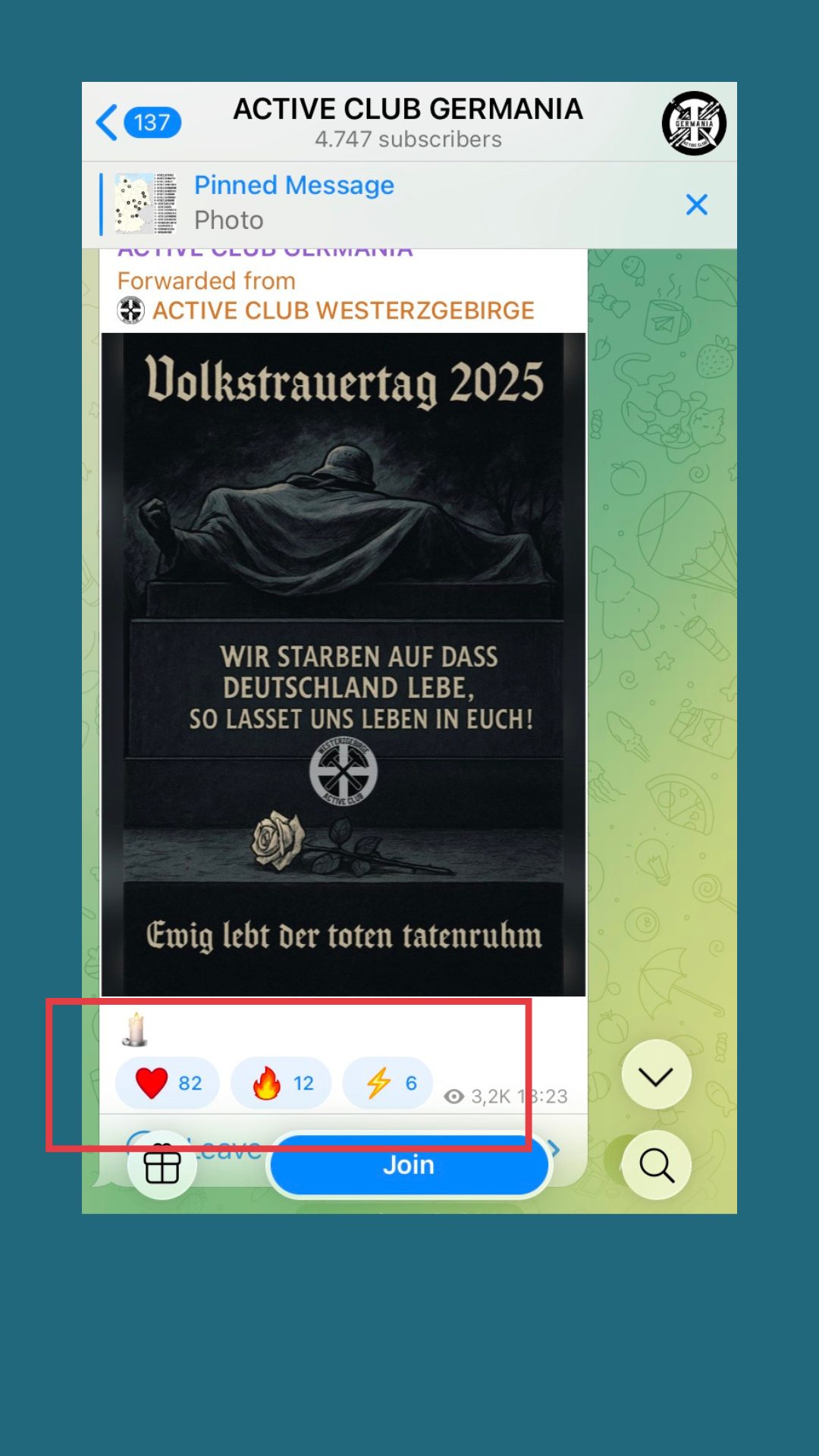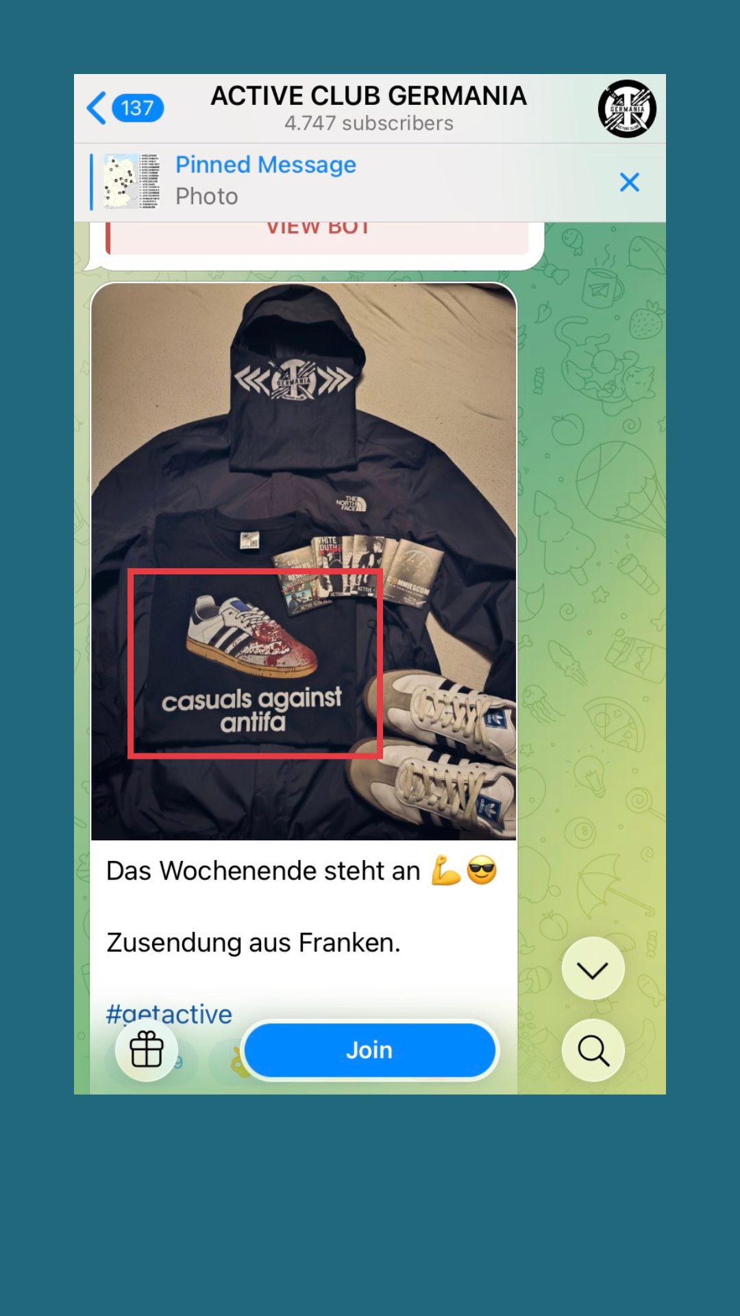 Auch in unserem kurzen Aufenthalt in dem Kanal „Active Club Germania“ sahen wir ein Bild mit Merchandise, in dem man Gewaltfantasien auslebt: „Casuals against antifa”, dazu ein blutiger Schuh. Auf einem anderen Bild verherrlicht man mit einem „Volkstrauertag“ die Wehrmacht. Wieder zustimmende Blitz-Emojis.