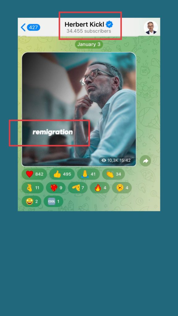In der Gruppe des FPÖ-Bundesparteiobmanns schreibt ausschließlich der Account „Herbert Kickl“. Mitglieder können keine eigenen Nachrichten versenden. Es ähnelt eher einem News-Feed. Der Begriff „Remigration“ fällt uns direkt in einigen Beiträgen auf. Es ist eine Wortschöpfung, die – beschönigend und vermeintlich neutral – erzwungene Deportation meint und fordert.