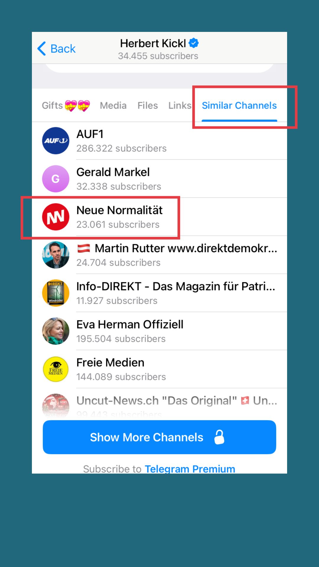 Auf1 ist als rechtsextrem eingestuftes Medium mit Sitz in Linz, gegründet von Stefan Magnet, der auch als Chefredakteur agiert. Der deutsche Verfassungsschutz überwacht den Sender. Telegram schlägt auch Martin Rutter als Kanal vor. Rutter ist ein österreichischer rechtsextremer Verschwörungstheoretiker und ehemaliger Politiker. Eva Hermann, ebenfalls vorgeschlagen, ist eine rechtspopulistische und verschwörungstheoretische Autorin. All diese Kanäle verbindet der Telegram-Algorithmus offenbar direkt mit der FPÖ.