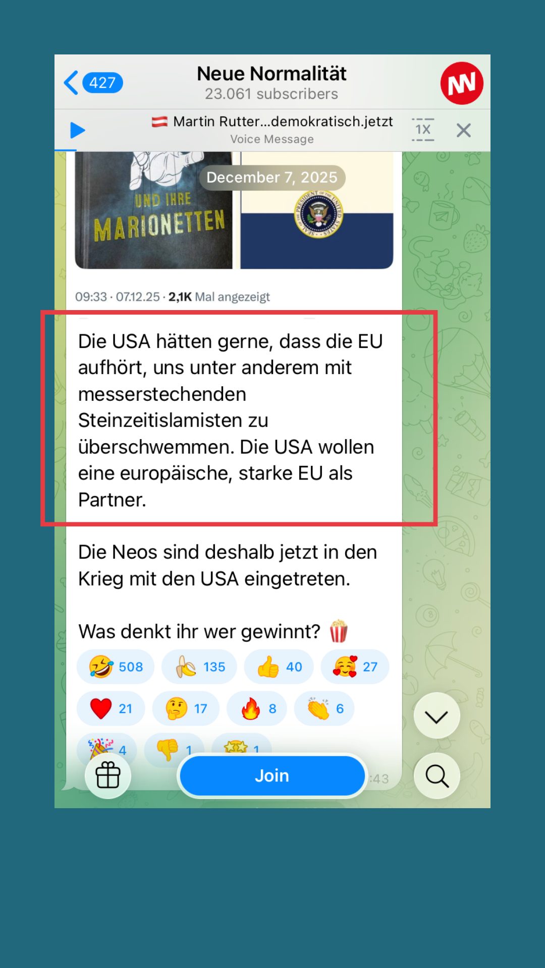 Wir entscheiden uns für den Kanal „Neue Normalität“. Über 20.000 Menschen sind hier Mitglied. Hier schreibt nur der Kanal „Neue Normalität“. Die User:in postet Links zu News-Artikeln oder eigene Meinungsbeiträge. Es geht viel um die USA, um Kriege und Innenpolitik. Geflüchtete bezeichnet man schon mal als „messerstechende Steinzeitislamisten“. Der Inhalt und die Sprache sind in diesem Kanal aggressiver und herablassender als in den FPÖ-Kanälen. Die vielen Emoji-Reaktionen unter den Beiträgen zeigen die Zustimmung und auch den Austausch der Gruppe.