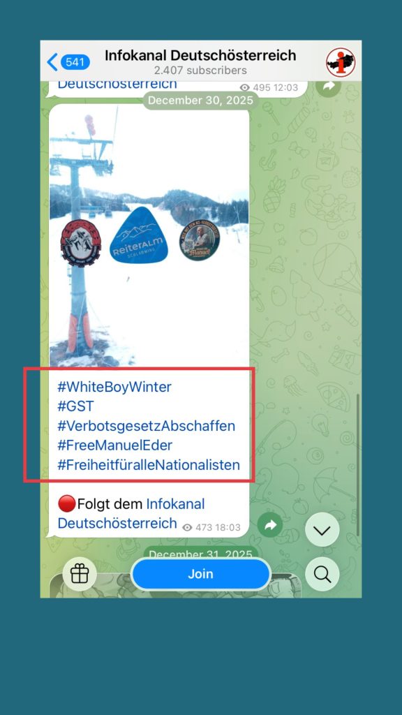 Das erste Bild, das wir in der Gruppe sehen: Sticker auf einem Skilift, darunter die Hashtags #Whiteboywinter, #VerbotsgesetzAbschaffen, #FreiheitfüralleNationalisten.