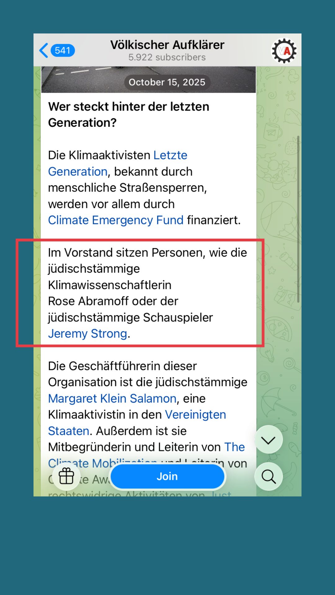 Im Kanal „Völkischer Aufklärer“ (knapp 6.000 Abonnent:innen) finden wir sehr schnell eine antisemitische Verschwörungstheorie rund um die Klima-Organisation „Letzte Generation“ mit dem Titel „Wer steckt hinter der letzten Generation?“. Man kritisiert, dass der Vorstand vom Climate Emergency Fund (eine Non-Profit-Organisation, die Einzelpersonen und Gruppen finanziert, darunter auch Letzte Generation) jüdischstämmig sei. Weiter schreibt die User:in, dass das Ziel dieser Organisation eine Deindustrialisierung der westlichen Länder ist. Indem die User:in ohne konkrete Beweise eine Verbindung zwischen vermeintlichen böswilligen Zielen und jüdischen Personen zieht, bedient sie sich typischer antisemitischer Verschwörungstheorien.
