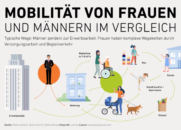 Ein typisches Fortbewegungsmuster sieht bei Frauen oft so aus: Sie bringen die Kinder in die Schule, gehen dann zur Arbeit, begleiten später ein Familienmitglied zum Arzt und erledigen am Heimweg den Einkauf. Diese Aneinanderreihung mehrerer miteinander verbundener Wege lässt sich bei Frauen weltweit beobachten.