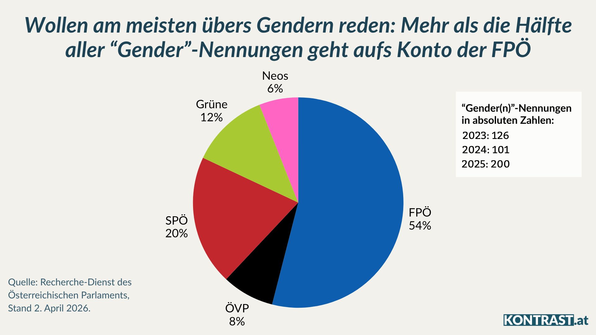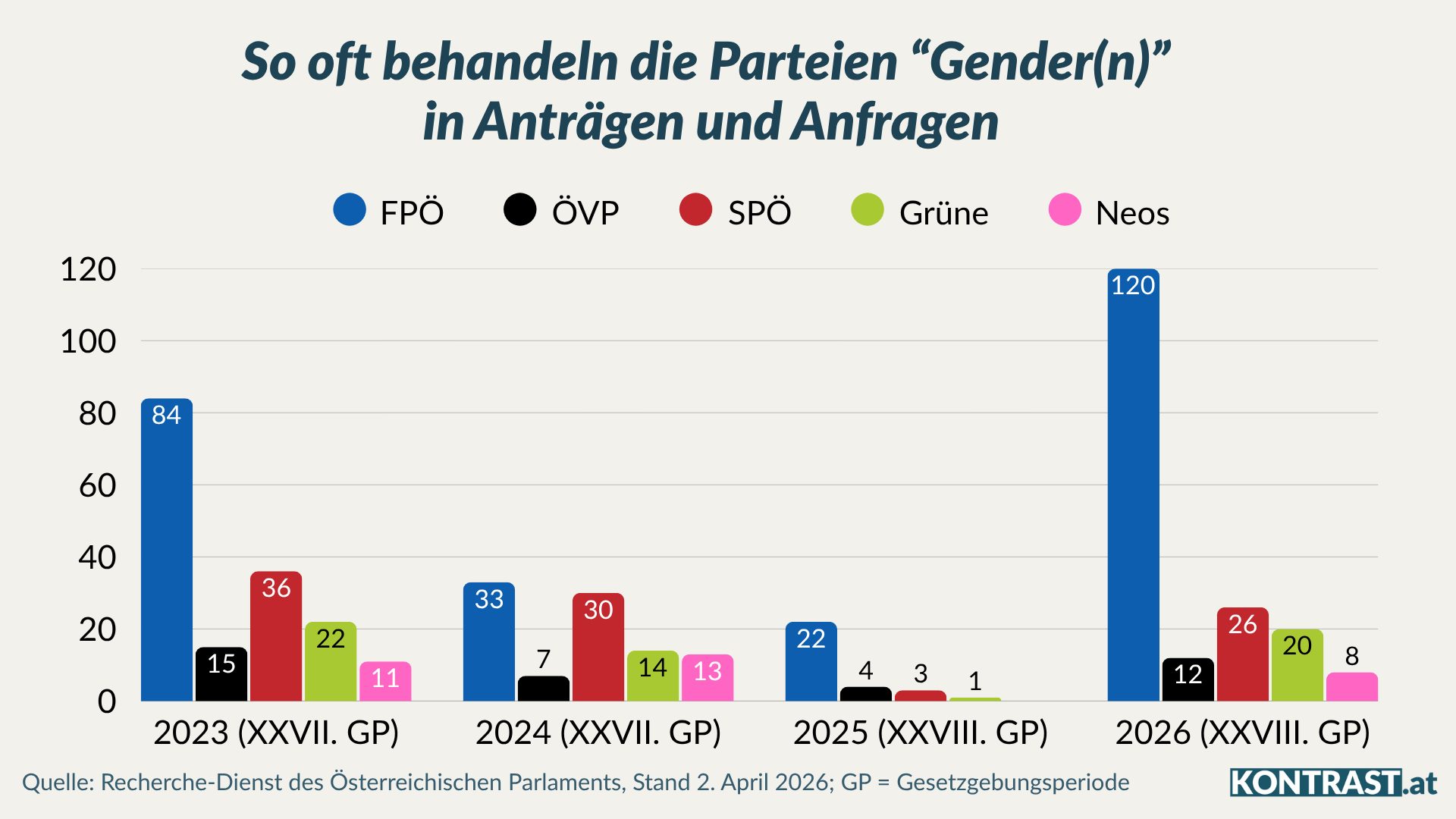 Beim Thema „Gender“ gab es seit 2020 dazu 836 parlamentarische Aktivitäten. Davon 364 durch die FPÖ. Allein im Jahr 2025 brachte die Partei 120 Initiativen ein. Die anderen Parlamentsparteien blieben deutlich darunter.