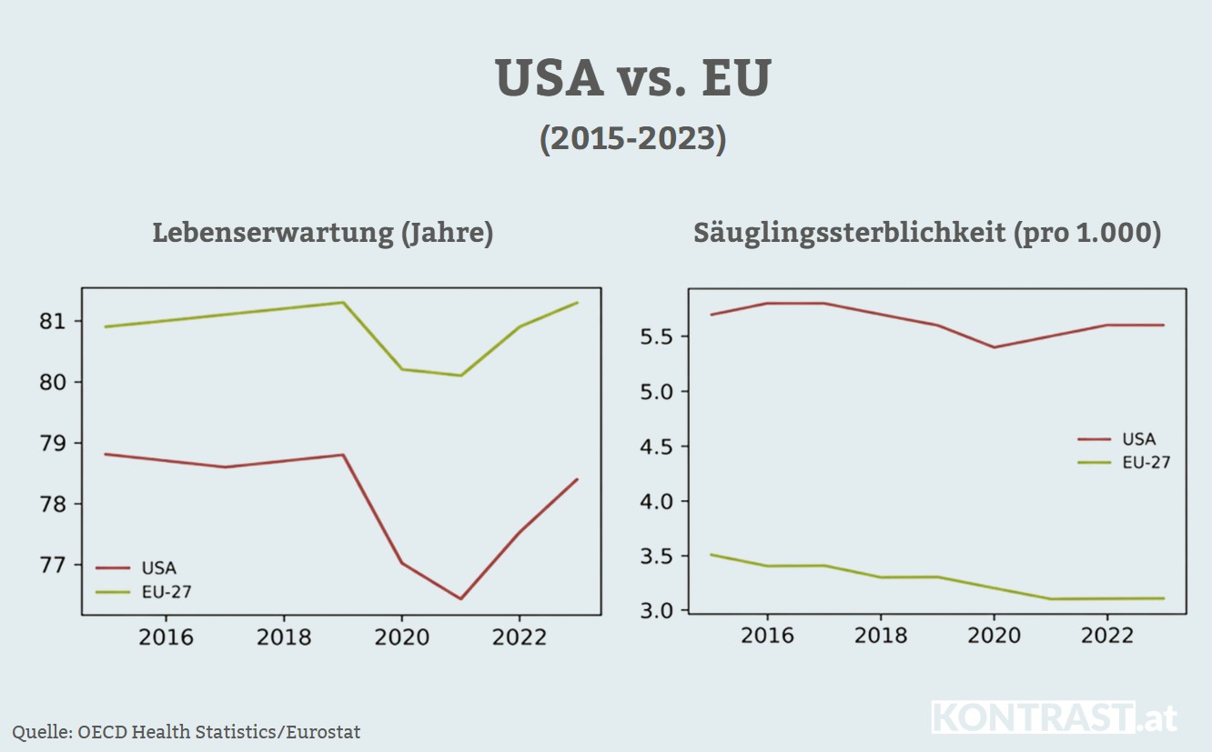 Auch bei der Säuglingssterblichkeit schneiden die Vereinigten Staaten schlechter ab. 2023 starben in der EU 12.280 Kinder vor ihrem ersten Lebensjahr, was 3,3 pro 1.000 Geburten entspricht. In den USA kamen 2023 auf 1.000 Geburten hingegen 5,6 Todesfälle.