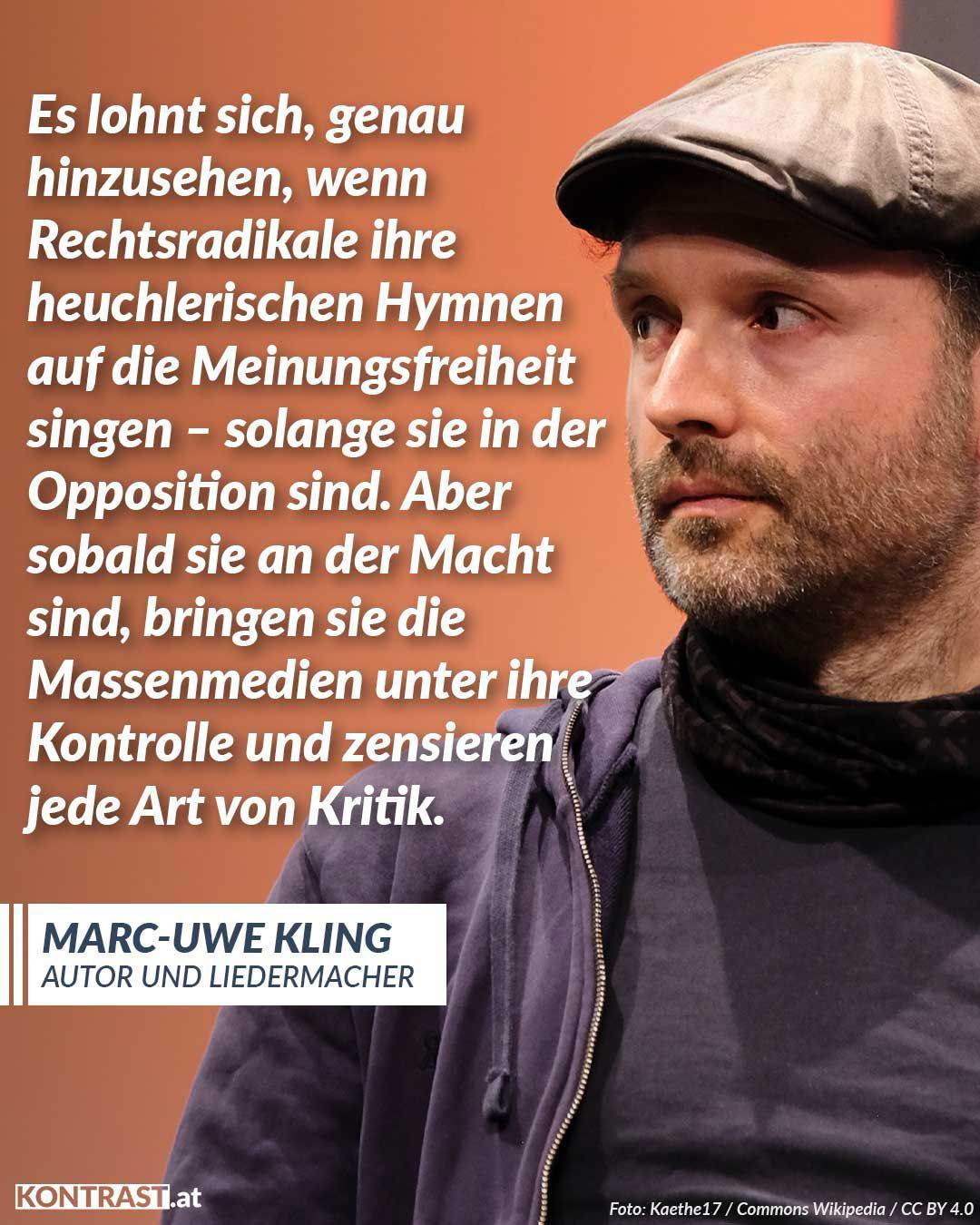 Zitat: Es lohnt sich, genau hinzusehen, wenn Rechtsradikale ihre heuchlerischen Hymnen auf die Meinungsfreiheit singen – solange sie in der Opposition sind. Aber sobald sie an der Macht sind, bringen sie die Massenmedien unter ihre Kontrolle und zensieren jede Art von Kritik. Marc-Uwe Kling