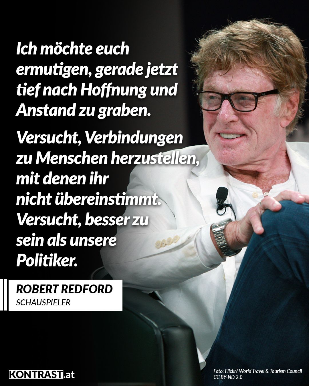 Zitat: Ich möchte euch ermutigen, gerade jetzt tief nach Hoffnung und Anstand zu graben. Versucht, Verbindungen zu Menschen herzustellen, mit denen ihr nicht übereinstimmt. Versucht, besser zu sein als unsere Politiker. Robert Redford