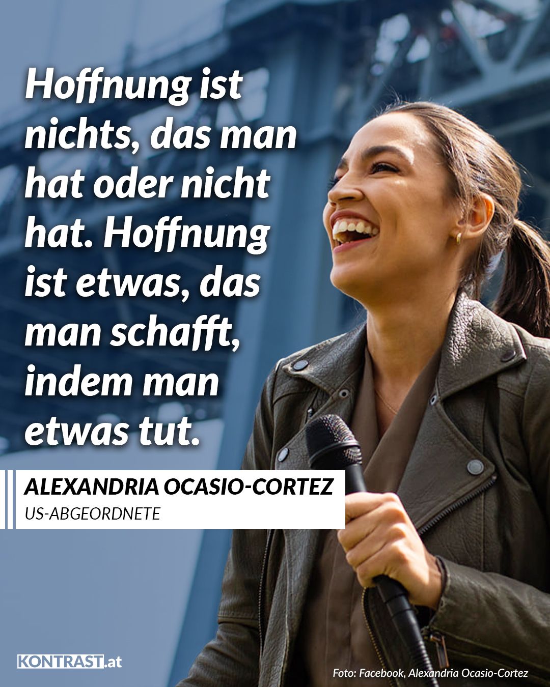 Zitat: „Hoffnung ist nichts, das man hat oder nicht hat. Hoffnung ist etwas, das man schafft, indem man etwas tut“, Alexandria Ocasio-Cortez