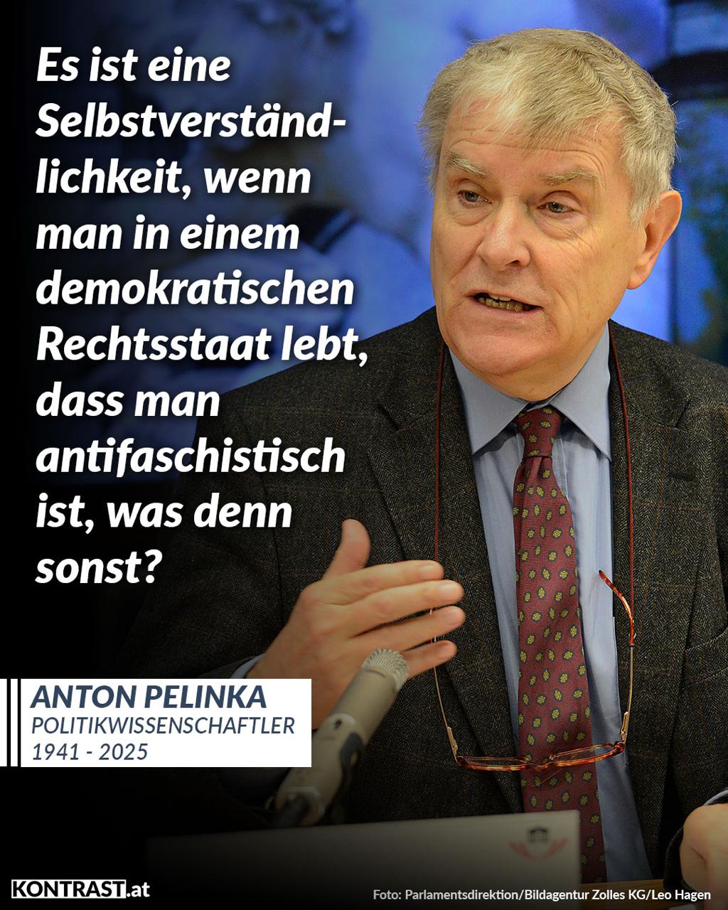 Anton Pelinka war einer der bekanntesten Politikwissenschaftler Österreichs. Er forschte und veröffentliche zahlreiche Bücher und Artikel zur Österreichischen Republik, zu Demokratie und Rechtsextremismus. Für seine umfangreiche publizistische Arbeit wurde Pelinka wiederholt ausgezeichnet. Zitat: Es ist eine Selbstverständlichkeit, wenn man in einem demokratischen Rechtsstaat lebt, dass man antifaschistisch ist, was denn sonst? Anton Pelinka
