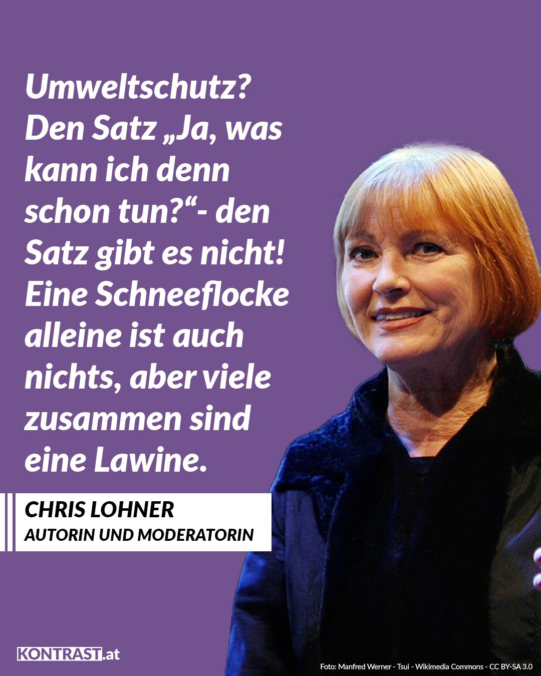 Gleichzeitig gilt: Das Klima schonen können wir alle. Zitat: Umweltschutz? Den Satz „Ja, was kann ich denn schon tun?“ – den Satz gibt es nicht! Eine Schneeflocke alleine ist auch nichts, aber viele zusammen sind eine Lawine. Chris Lohner