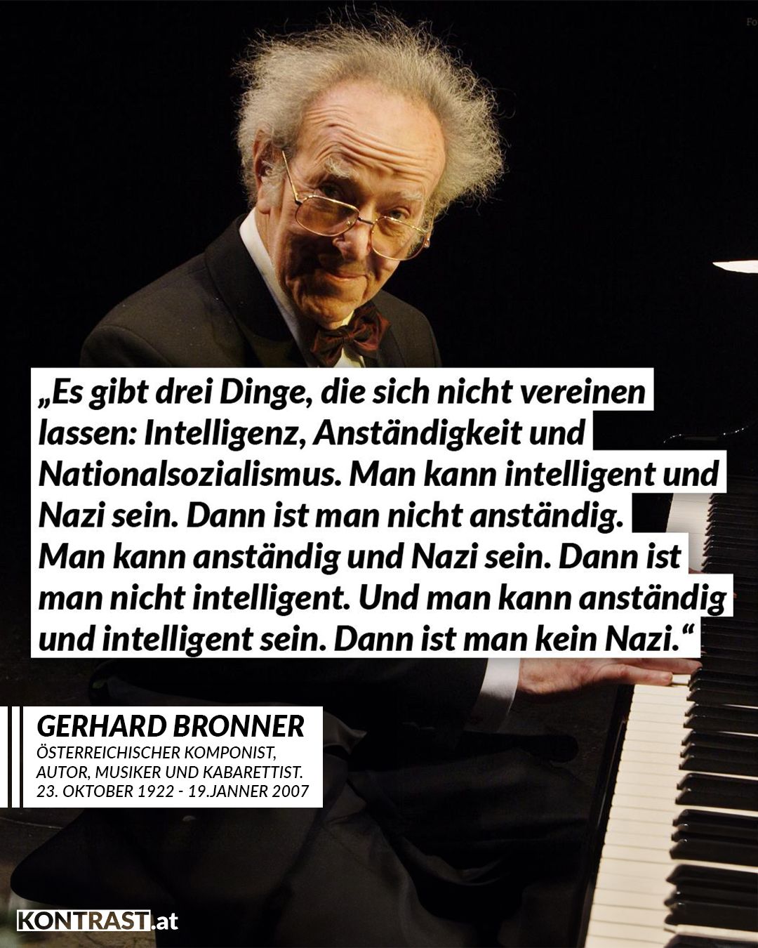 Gerhard Bronner prägte die Kabarettszene der Nachkriegszeit, nahm 60 Langspielplatten auf und hatte hunderte eigene TV- und Radioprogramme. Dafür wurde er u.a. mit dem Österreichischen Ehrenkreuz für Wissenschaft und Kunst ausgezeichnet. Er überlebte den Holocaust – sein Bruder und seine Eltern nicht. Zitat: Es gibt drei Dinge, die sich nicht vereinen lassen: Intelligenz, Anständigkeit und Nationalsozialismus. Man kann intelligent und Nazi sein. Dann ist man nicht anständig. Man kann anständig und Nazi sein. Dann ist man nicht intelligent. Und man kann anständig und intelligent sein. Dann ist man kein Nazi. Gerhard Bronner