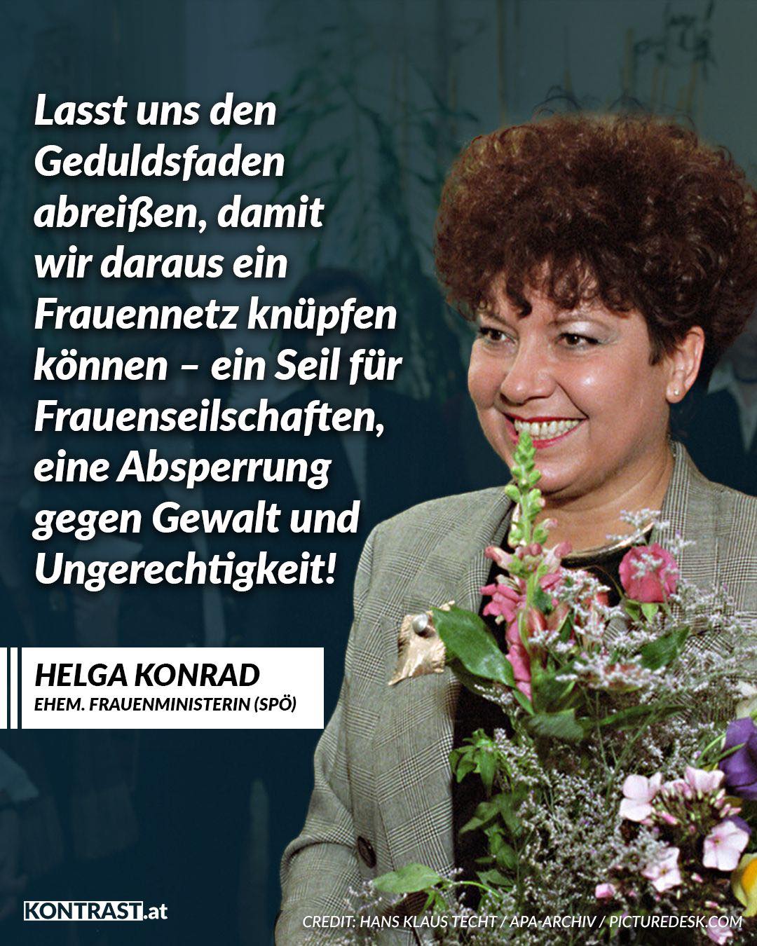 Helga Konrad war von 1995 bis 1997 Frauenministerin (SPÖ) in Österreich. Mit ihrer viel diskutierten Kampagne „halbe/halbe“ wollte sie dazu beitragen, dass sich Männer und Frauen Kindererziehung, Hausarbeit und Pflege partnerschaftlich und gerecht teilen. Zitat: Lasst uns den Geduldsfaden abreißen, damit wir daraus ein Frauennetz knüpfen können – ein Seil für Frauenseilschaften, eine Absperrung gegen Gewalt und Ungerechtigkeit! Helga Konrad