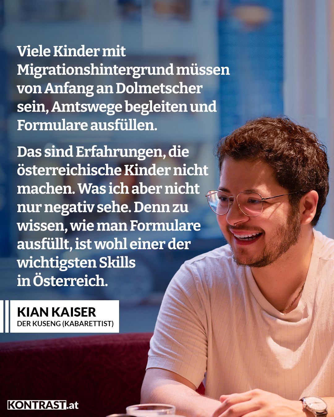 Er ist einer der Nachwuchsstars auf Österreichs Kabarett-Bühnen: Kian Kaiser alias Der Kuseng ist aktuell mit seinem ersten Programm „Hoamatlond, Hoamatlond“ auf Tour. Mit uns hat er über seine Kindheit, österreichische Ämter und Fragen rund um Identität und Schubladen gesprochen. Zitat: Viele Kinder mit Migrationshintergrund müssen von Anfang an Dolmetscher sein, Amtswege begleiten und Formulare ausfüllen. Das sind Erfahrungen, die österreichische Kinder nicht machen. Was ich aber nicht nur negativ sehe. Denn zu wissen, wie man Formulare ausfüllt, ist wohl einer der wichtigsten Skills in Österreich. Kian Kaiser