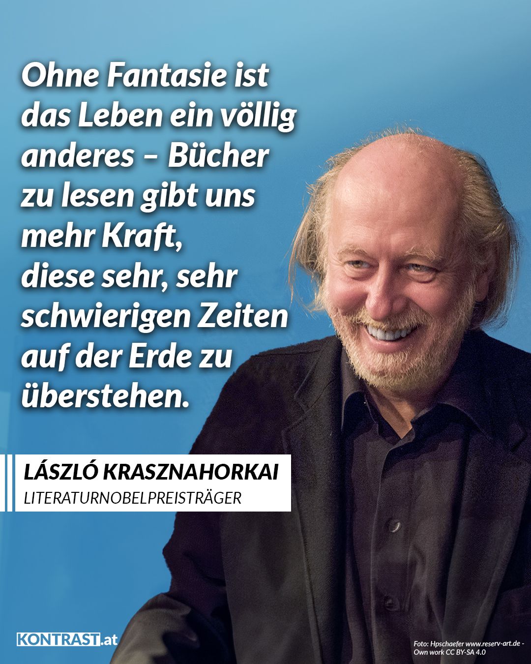 Zitat: Ohne Fantasie ist das Leben ein völlig anderes – Bücher zu lesen gibt uns mehr Kraft, diese sehr, sehr schwierigen Zeiten auf der Erde zu überstehen. László Krasznahorkai