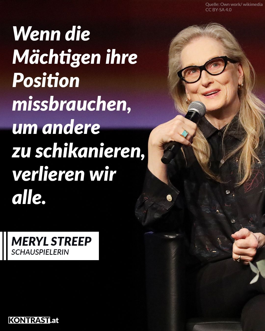 Meryl Streep gilt als eine der bedeutendsten Schauspielerinnen der Filmgeschichte. Seit Jahrzehnten verkörpert sie komplexe Rollen in Drama, Komödie und Musical. Sie wurde mehrfach mit dem Oscar ausgezeichnet und 21 Mal nominiert. Aber sie begeistert ihre Fans nicht nur durch ihr außerordentliches Schauspieltalent, sondern auch durch ihre bewegenden Reden. Bei den Golden Globes im Jahr 2017 kritisierte sie US-Präsidenten Donald Trump, weil er sich über einen behinderten Reporter lustig machte. Sie sagt außerdem: „Respektlosigkeit fördert Respektlosigkeit. Gewalt fördert Gewalt“. Zitat: Wenn die Mächtigen ihre Position missbrauchen, um andere zu schikanieren, verlieren wir alle. Meryl Streep