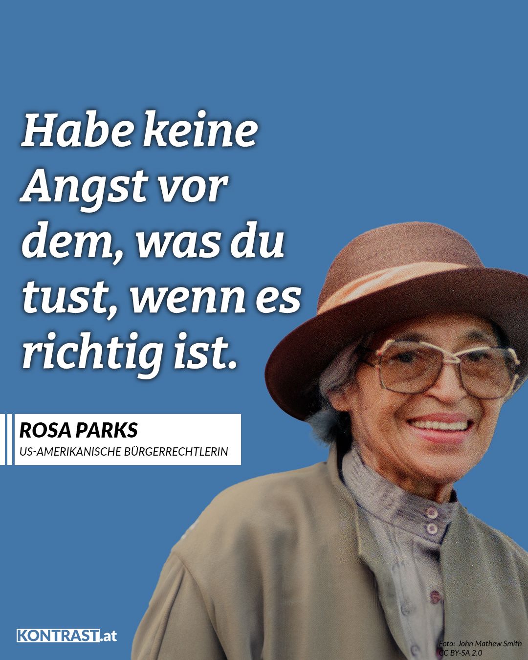 Am 1. Dezember 1955 weigerte sie sich, ihren Sitzplatz in einem Bus für einen weißen Fahrgast zu räumen. Ihr Handeln inspirierte die afro-amerikanische Bürgerrechtsbewegung zum Bus-Boykott von Montgomery und war der Beginn des Endes der Rassentrennung in den Vereinigten Staaten. Zitat: Habe keine Angst vor dem, was du tust, wenn es richtig ist. Rosa Parks