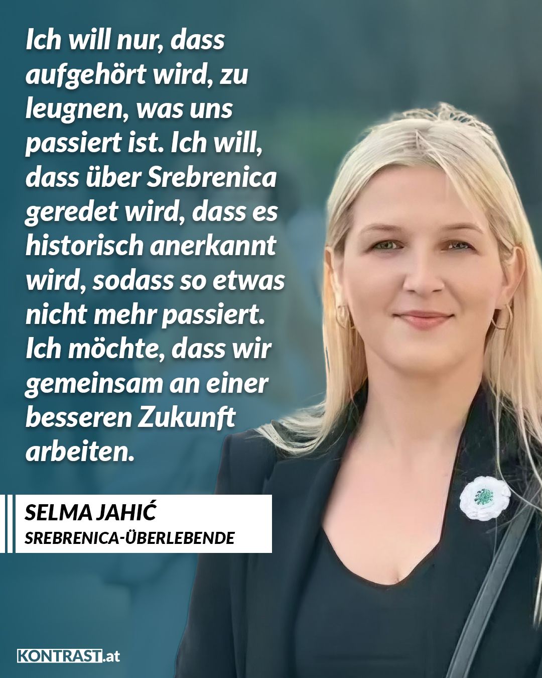 Im Jahr 2023 erklärte die UN-Vollversammlung den 11. Juli zum Internationalen Gedenktag für die Opfer von Srebrenica. Auch Österreich stimmte der Resolution zu. Selma Jahić überlebte als Kind den Völkermord in Srebrenica. Sie setzt sich dafür ein, dass nicht vergessen wird, was damals passierte und möchte gemeinsam eine bessere Zukunft gestalten. Zitat: Ich will nur, dass aufgehört wird, zu leugnen, was uns passiert ist. Ich will, dass über Srebrenica geredet wird, dass es historisch anerkannt wird, sodass so etwas nicht mehr passiert. Ich möchte, dass wir gemeinsam an einer besseren Zukunft arbeiten. Selma Jahic