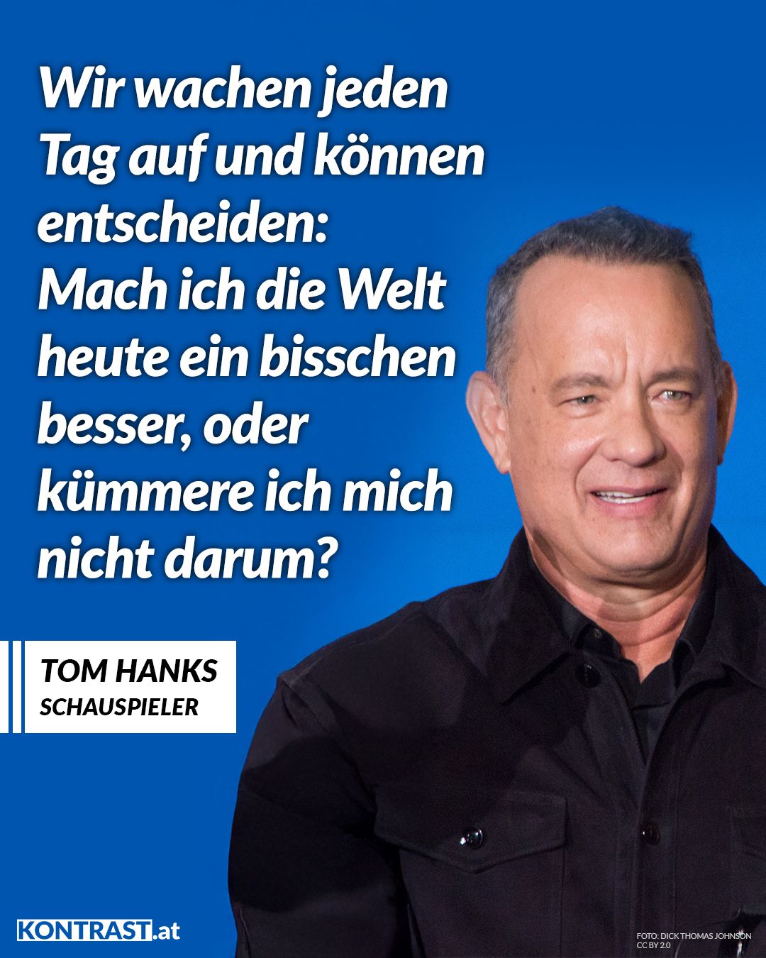 Viele kennen den Schauspieler und zweifachen Oscar-Preisträger Tom Hanks aus Filmen wie “Forrest Gump” oder “Philadelphia”. Gemeinsam mit seiner Frau hat er für Gesundheitsinitiativen, die Unterstützung von Veteranen und Hilfe für die Opfer von Naturkatastrophen gespendet. Zitat: Wir wachen jeden Tag auf und können entscheiden: Mach ich die Welt heute ein bisschen besser, oder kümmere ich mich nicht darum? Tom Hanks