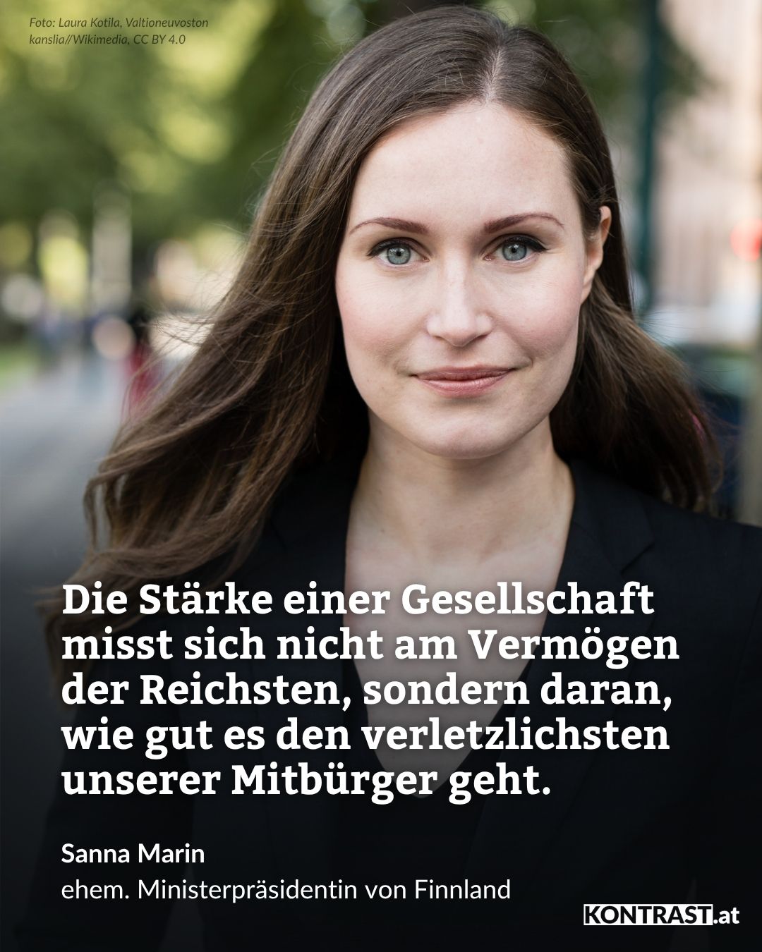 Zitat: Die Stärke einer Gesellschaft misst sich nicht am Vermögen der Reichsten, sondern daran, wie gut es den verletzlichsten unserer Mitbürger geht. Die Frage, die wir stellen müssen, ist: Kann jeder von uns ein gutes und würdevolles Leben führen?“ Sanna Marin