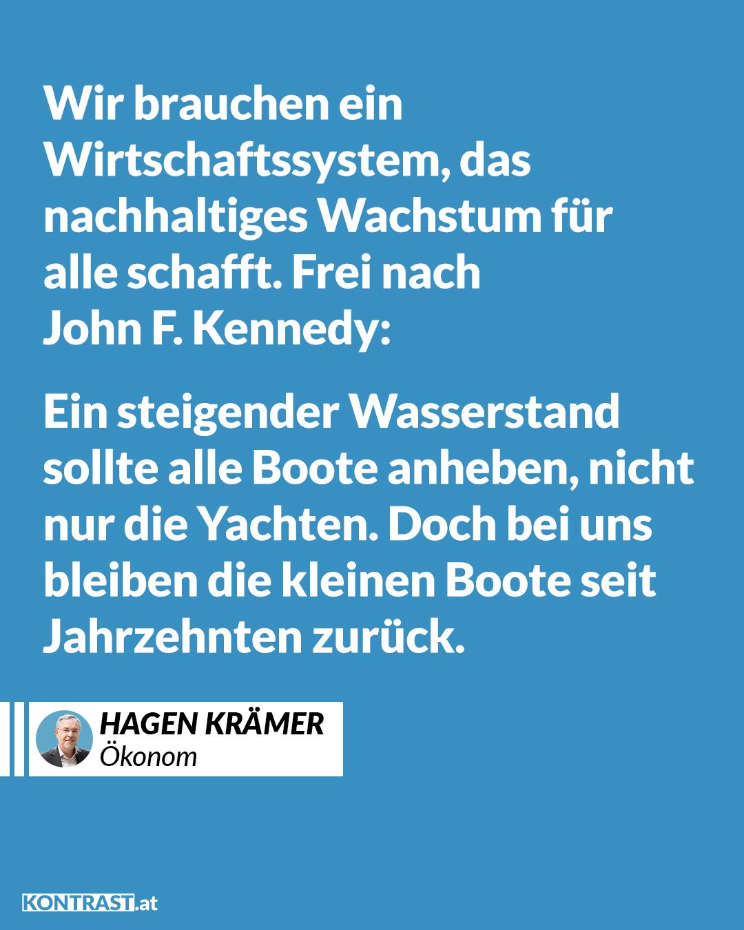 2. Während die Reichen immer reicher werden, gibt es immer mehr Menschen, die mit teuren Lebensmittelpreisen und steigenden Mieten zu kämpfen haben. Der Ökonom Hagen Krämer fordert, dass unser Wirtschaftssystem verändert werden muss. Die Löhne sollen steigen, und der Sozialstaat muss ausfinanziert sein, damit die Menschen sich in schwierigen Situationen auf ihn verlassen können. Finanziert werden soll das durch höhere Steuern auf die Reichsten der Reichen und eine fairere Aufteilung der Unternehmensgewinne zwischen Arbeiter:innen und Besitzer:innen. Während die Reichen immer reicher werden, gibt es immer mehr Menschen, die mit teuren Lebensmittelpreisen und steigenden Mieten zu kämpfen haben. Der Ökonom Hagen Krämer fordert, dass unser Wirtschaftssystem verändert werden muss. Die Löhne sollen steigen, und der Sozialstaat muss ausfinanziert sein, damit die Menschen sich in schwierigen Situationen auf ihn verlassen können. Finanziert werden soll das durch höhere Steuern auf die Reichsten der Reichen und eine fairere Aufteilung der Unternehmensgewinne zwischen Arbeiter:innen und Besitzer:innen. Zitat: Wir brauchen ein Wirtschaftssystem, das nachhaltiges Wachstum für alle schafft. Frei nach John F. Kennedy: Ein steigender Wasserstand sollte alle Boote anheben, nicht nur die Yachten. Doch bei uns bleiben die kleinen Boote seit Jahrzehnten zurück. Hagen Krämer