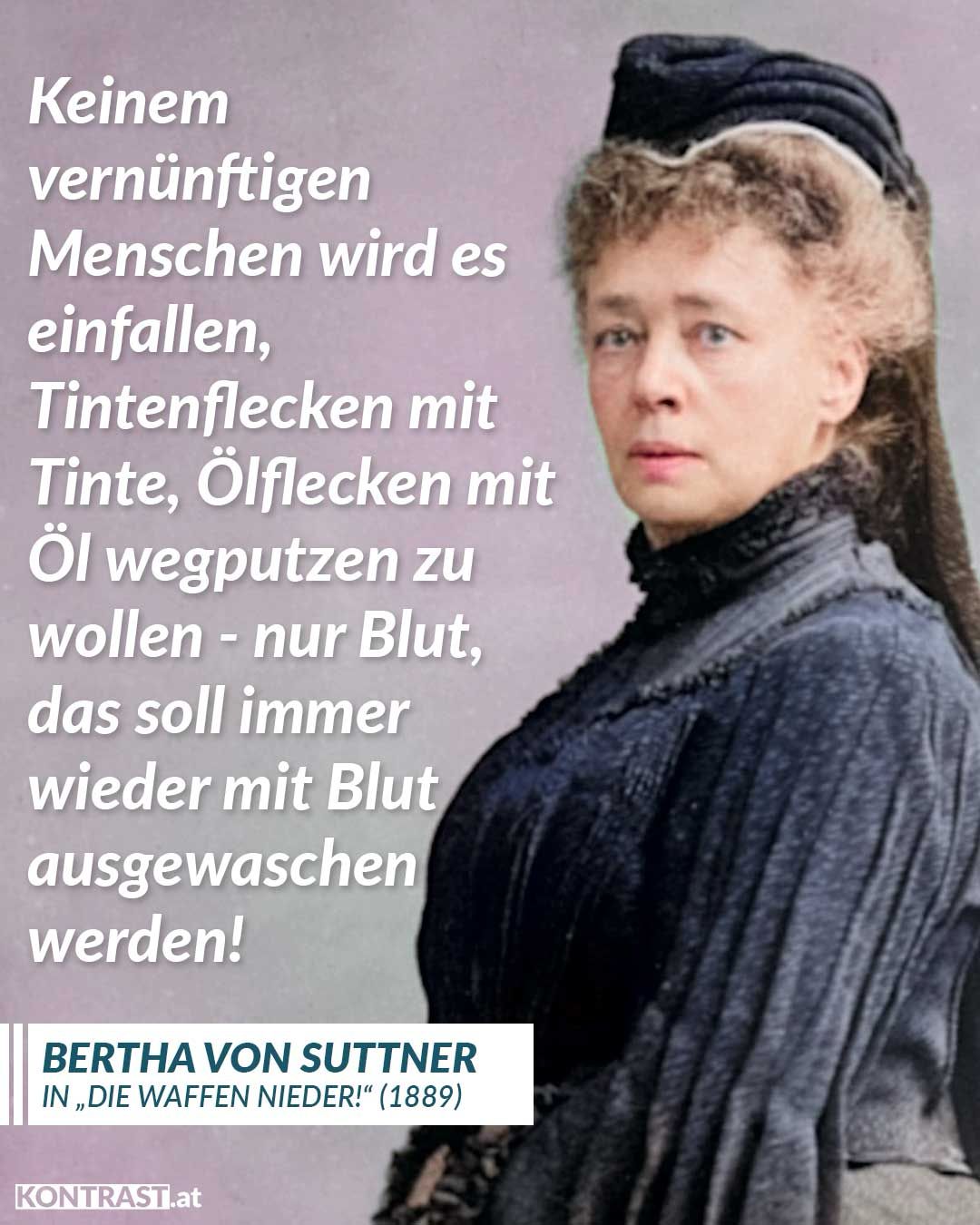 Die Pazifistin und Schriftstellerin Bertha von Suttner war Teil der epochemachenden Frauen- und Friedensbewegung. Der Roman „Die Waffen nieder!“ gehört zu ihren berühmtesten Werken. 1906 wurde ihr als erste Frau der Friedensnobelpreis verliehen. Zitat: Keinem vernünftigen Menschen wird es einfallen, Tintenflecken mit Tinte, Ölflecken mit Öl wegputzen zu wollen - nur Blut, das soll immer wieder mit Blut ausgewaschen werden! Bertha von Suttner